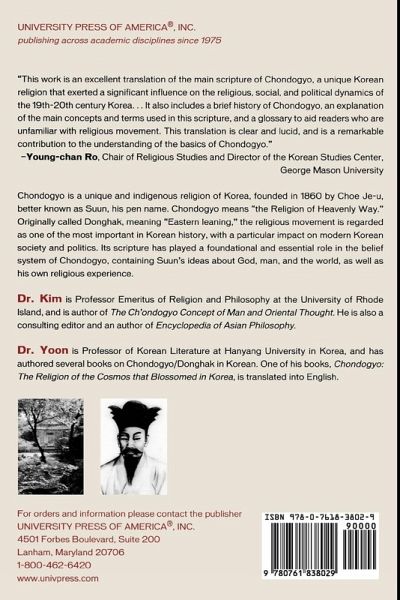 Dr. Kim is Professor Emeritus of Religion and Philosophy at the University of Rhode Island, and is author of The Ch'ondogyo Concept of Man and Oriental Thought. He is also a consulting editor and an author of Encyclopedia of Asian Philosophy. Dr. Yoon is Professor of Korean Literature at Hanyang University in Korea and has authored several books on Chondogyo/Donghak in Korean. One of his books, Chondogyo: The Religion of the Cosmos that Blossomed in Korea, is translated into English.