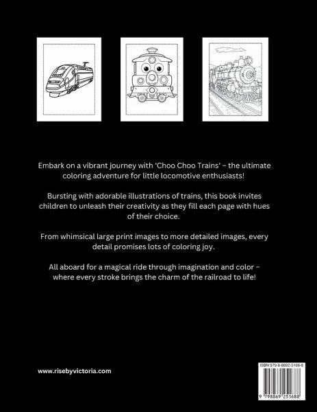 Embark on a vibrant journey with 'Choo Choo Trains' - the ultimate coloring adventure for little locomotive enthusiasts! Bursting with adorable illustrations of trains, this book invites children to unleash their creativity as they fill each page with hues of their choice. From whimsical large print images to more detailed images, every detail promises lots of coloring joy. All aboard for a magical ride through imagination and color - where every stroke brings the charm of the railroad to life!