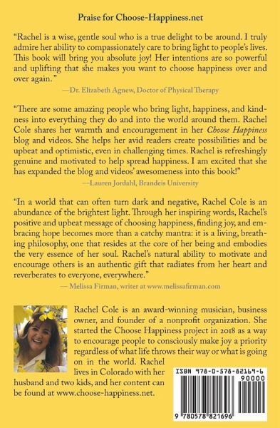 Happiness doesn't just happen: it's a choice we make every day. Happiness is more than an emotion or an involuntary reaction to life events. It's a state of mind, a choice to focus on the things that bring us joy instead of those that bring pain, to reach out to others rather than turning inward. Regardless of what's going on around us or how hard things may seem, our inner life doesn't have to depend upon our outer circumstances: we can find happiness if we choose to. Rachel Cole's collection of essays cover life's big and little moments, from dusty pipes and children's games to being hurt by a dear friend or even grieving for the loss of loved ones. In each moment, she offers insights for how we can store up joy in the happy times and find light in the dark times. Above all, she demonstrates that, no matter how difficult it may seem, we can always find a way to choose happiness.