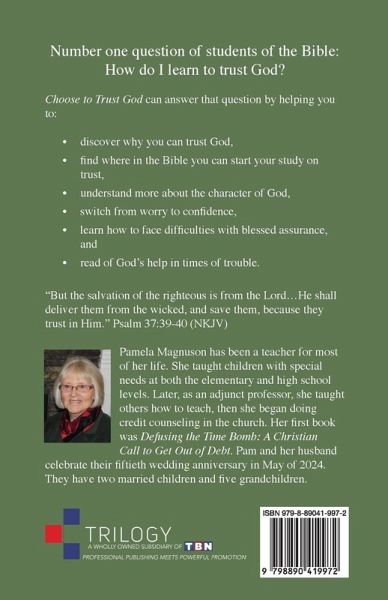 Number one question of students of the Bible: How do I learn to trust God? Choose to Trust God can answer that question by helping you to:discover why you can trust God, find where in the Bible you can start your study on trust, understand more about the character of God, switch from worry to confidence, learn how to face difficulties with blessed assurance, and read of God's help in times of trouble. "But the salvation of the righteous is from the Lord...He shall deliver them from the wicked, and save them, because they trust in Him." Psalm 37:39-40 (NKJV)