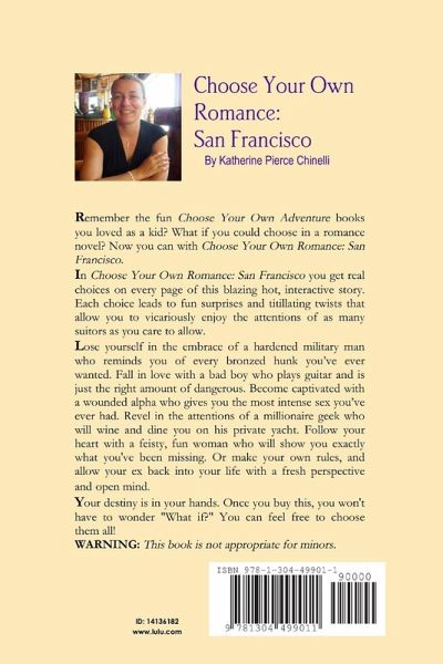 In Choose Your Own Romance: San Francisco you get real choices on every page of this blazing hot, interactive story. Each choice leads to fun surprises and titillating twists that allow you to vicariously enjoy the attentions of as many suitors as you care to allow. Lose yourself in the embrace of a hardened military man who reminds you of every bronzed hunk you've ever wanted. Fall in love with a bad boy who plays guitar and is just the right amount of dangerous. Become captivated with a wounded alpha who gives you the most intense sex you've ever had. Revel in the attentions of a millionaire geek who will wine and dine you on his private yacht. Follow your heart with a feisty, fun woman who will show you exactly what you've been missing. Or make your own rules, and allow your ex back into your life with a fresh perspective and open mind. Your destiny is in your hands. Once you buy this, you won't have to wonder "What if?" You can feel free to choose them all!