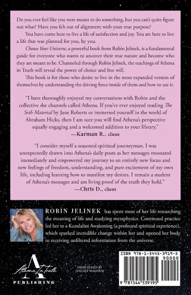 Do you ever feel like you were meant to do something, but you can't quite figure out what? Have you felt out of alignment with your true purpose? You have come here to live a life of satisfaction and joy. You are here to live a life that was planned for you, by you. Choose Your Universe, a powerful book from Robin Jelinek, is a fundamental guide for everyone who wants to uncover their true nature and become who they are meant to be. Channeled through Robin Jelinek, the teachings of Athena in Truth will reveal the power of choice and free will. This book is for those who desire to live in the most expanded version of themselves by understanding the driving force inside of them and how to use it.