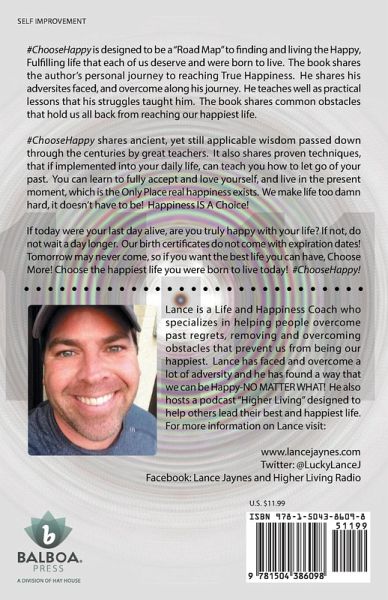 #ChooseHappy is designed to be a "Road Map" to finding and living the Happy, Fulfilling life that each of us deserve and were born to live. The book shares the author’s personal journey to reaching True Happiness. He shares his adversites faced, and overcome along his journey. He teaches well as practical lessons that his struggles taught him. The book shares common obstacles that hold us all back from reaching our happiest life. #ChooseHappy shares ancient, yet still applicable wisdom passed down through the centuries by great teachers. It also shares proven techniques, that if implemented into your daily life, can teach you how to let go of your past. You can learn to fully accept and love yourself, and live in the present moment, which is the Only Place real happiness exists. We make life too damn hard, it doesn’t have to be! Happiness IS A Choice! If today were your last day alive, are you truly happy with your life? If not, do not wait a day longer. Our birth certificates do not come with expiration dates! Tomorrow may never come, so if you want the best life you can have, Choose More! Choose the happiest life you were born to live today! #ChooseHappy!