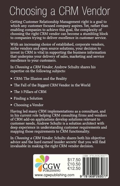 Getting Customer Relationship Management right is a goal to which any customer focused company aspires. Yet, rather than enabling companies to achieve this goal, the complexity of choosing the right CRM vendor can become a stumbling block to companies trying to deliver excellence in customer service. With an increasing choice of established, corporate vendors, niche vendors and open source solutions, your decision to invest in CRM is vital in supporting the business information that underpins your delivery of sales, marketing and service excellence to your customers. In Choosing a CRMVendor, Andrew Schultz shares his expertise on the following subjects: ¿ CRM: The Illusion and the Reality ¿ The Fall of the Biggest CRM Vendor in the World ¿ The 3 Pillars of CRM ¿ Finding a Solution ¿ Choosing a Vendor Having led many CRM implementations as a consultant, and in his current role helping CRM consulting firms and vendors of CRM add-on applications develop solutions relevant to customer needs, Andrew Schultz is a solution architect with deep experience in understanding customer requirements and mapping those requirements to CRM functionality. In Choosing a CRMVendor, Schultz shares both his objective advice and the hard earned 'insider secrets' that you will find invaluable in making the right CRM vendor decision.
