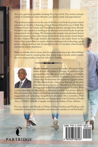 Are you a parent or guardian looking for a top-notch 21st-century private school in Zambia, one that will meet your family needs and expectations? This profound question is at the core of this first-ever book on private school education in Zambia. Choosing a Good Private School for your Child: The Ultimate Guide for Parents and Guardians in Zambia emerged from Monde Nyambe's vast experience working as an educator and school leader in private international school settings. The book provides insights into pertinent factors that assist parents as they make important decisions about private school choices for their children. Through research and experience, the author draws on the views of key stakeholders to create a decision-making tool on choosing a good private school, ideal not only for parents but also for teachers, school leaders and private school proprietors. Make no mistake, this is a must-read for parents intending to give their children a solid head start by ensuring that they secure a good private school amidst the ever-rising number of private schools in Zambia.