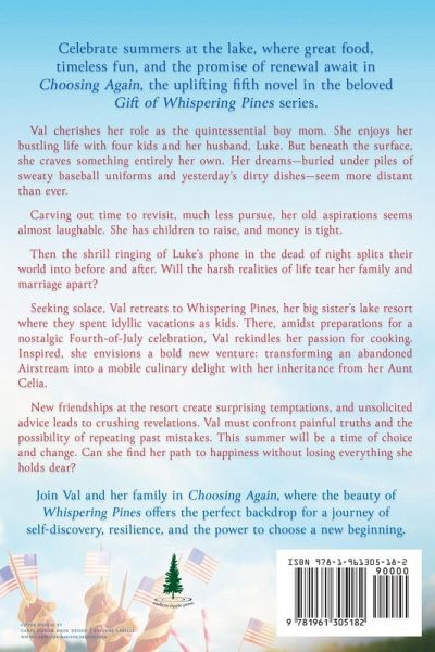 Celebrate summers at the lake, where great food, timeless fun, and the promise of renewal await in Choosing Again, the uplifting fifth novel in the beloved Gift of Whispering Pines series. Val cherishes her role as the quintessential boy mom. She enjoys her bustling life with four kids and her husband, Luke. But beneath the surface, she craves something entirely her own. Her dreams-buried under piles of sweaty baseball uniforms and yesterday's dirty dishes-seem more distant than ever. Carving out time to revisit, much less pursue, her old aspirations seems almost laughable. She has children to raise, and money is tight. Then the shrill ringing of Luke's phone in the dead of night splits their world into before and after. Will the harsh realities of life tear her family and marriage apart? Seeking solace, Val retreats to Whispering Pines, her big sister's lake resort where they spent idyllic vacations as kids. There, amidst preparations for a nostalgic Fourth-of-July celebration, Val rekindles her passion for cooking. Inspired, she envisions a bold new venture: transforming an abandoned Airstream into a mobile culinary delight with her inheritance from her Aunt Celia. New friendships at the resort create surprising temptations, and unsolicited advice leads to crushing revelations. Val must confront painful truths and the possibility of repeating past mistakes. This summer will be a time of choice and change. Can she find her path to happiness without losing everything she holds dear? Join Val and her family in Kimberly Diede's Choosing Again, where the beauty of Whispering Pines offers the perfect backdrop for a journey of self-discovery, resilience, and the power to choose a new beginning.