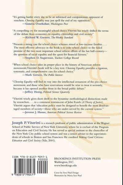 America is now in the second generation of debate on school choice. The first was prompted by the provocative voucher proposal conceived by Milton Friedman in 1955 and brought into the mainstream by Chubb and Moe's seminal book Politics, Markets, and American Schools (Brookings, 1990). It introduced a pure market model in which schools would be publicly financed but privately operated. While opponents continue to contend that choice will lead to the demise of public education, the weakening of civil society, and the fostering of separate and unequal systems of education, Joseph P. Viteritti argues that these long-held assertions must give way to present realities. The rich and diverse experience we have had with magnet schools, controlled choice, inter-district choice, charter schools, privately funded vouchers, and public vouchers in Milwaukee and Cleveland provides a solid basis for crafting a choice policy that enhances the educational opportunities of children whose needs are not being met by the present system of public education. Drawing on his background as a political scientist, legal scholar, and education practitioner, Viteritti starts his book with the promise articulated in the landmark Brown decision of 1954. After reviewing a variety of policy initiatives enacted to promote educational opportunity, he finds that the nation has fallen short of providing decent schooling for its most disadvantaged children, and in so doing has delayed the movement toward social and political equality. Viteritti does not contend that choice in the form of charter schools or vouchers for the poor is a solution to racial inequality, but he believes that these forms of choice can move the country in the proper direction. He insists that the nation cannot pretend to have a serious commitment to the goal of educational equality as long as choice is available only to those with the private means to afford it. Acknowledging the serious legal and civic concerns registered by choice opponents, Viteritti turns their arguments on their heads. He proposes that providing poor people with public support to attend religious schools is consistent with the pluralist constitutional model envisioned by Madison and the practices common to contemporary democratic societies. He explains how denying choice to the poor undermines the redistributive social agenda of the modern liberal state, and how a strict standard of church-state separation is out of touch with the culture of poor minority communities where the church is the most viable institution for social progress. Viteritti warns that by failing to appreciate the crucial role that religious congregations play in inner-city neighborhoods, liberal social analysts have compromised the civic vitality of poor communities. He also admonishes conservatives to abandon the pure market approach to education reform in favor of a choice policy designed specifically to benefit the poor. He concludes that choice merits support from all sides of the political spectrum, because a sound education is an essential foundation for any policy strategy designed to promote a healthy democratic society.