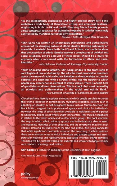 Choosing Ethnic Identity explores the ways in which people are able to choose their ethnic identities in contemporary multiethnic societies such as the USA and Britain. Notions such as adopting an identity, or self-designated terms, such as Black British and Asian American, suggest the importance of agency and choice for individuals. However, the actual range of ethnic identities available to individuals and the groups to which they belong are not wholly under their control. These identities must be negotiated in relation to both the wider society and coethnics. The ability of minority individuals and groups to assert or recreate their own self-images and ethnic identities, against the backdrop of ethnic and racial labelling by the wider society, is important for their self-esteem and social status. This book examines the ways in which ethnic minority groups and individuals are able to assert and negotiate ethnic identities of their choosing, and the constraints structuring such choices. By drawing on studies from both the USA and Britain, Miri Song concludes that while significant constraints surround the exercising of ethnic options, there are numerous ways in which ethnic minority individuals and groups contest and assert particular meanings and representations associated with their ethnic identities.