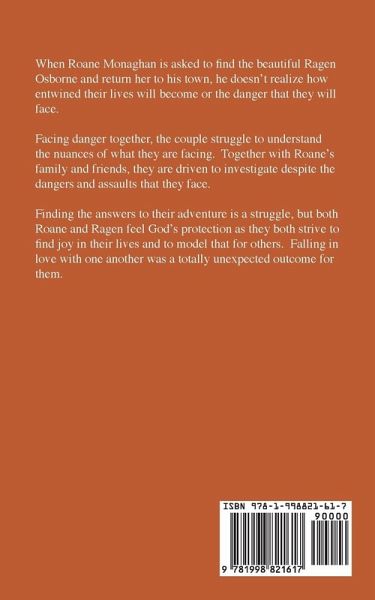 When Roane Monaghan is asked to find the beautiful Ragen Osborne and return her to his town, he doesn't realize how entwined their lives will become or the danger that they will face. Facing danger together, the couple struggle to understand the nuances of what they are facing. Together with Roane's family and friends, they are driven to investigate despite the dangers and assaults that they face. Finding the answers to their adventure is a struggle, but both Roane and Ragen feel God's protection as they both strive to find joy in their lives and to model that for others. Falling in love with one another was a totally unexpected outcome for them.