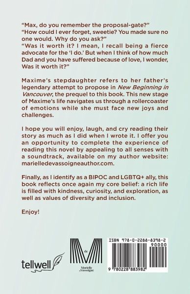 "Max, do you remember the proposal-gate?" "How could I ever forget, sweetie? You made sure no one would. Why do you ask?" "Was it worth it? I mean, I recall being a fierce advocate for the 'I do.' But when I think of how much Dad and you have suffered because of love I wonder. Was it worth it?" Maxime's stepdaughter refers to her father's legendary attempt to propose in New Beginning in Vancouver, the prequel to this book. This new stage of Maxime's life navigates us through a rollercoaster of emotions while she must face new joys and challenges. I hope you will enjoy, laugh and cry reading their story as much as I did when I wrote it. I offer you an opportunity to complete the experience of reading this novel appealing to all senses with a soundtrack, available on my author website: marielledevassoigneauthor.com. Finally, as I identify as a BIPOC and LGBTQ+ ally, this book reflects once again my core belief: a rich life is filled with kindness, curiosity, and exploration, as well as values of diversity and inclusion. Enjoy!