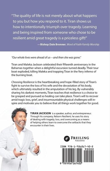 "Our whole lives were ahead of us-and then she was gone." Tiran and Maleka Jackson celebrated their fifteenth anniversary in the Bahamas together when a delightful excursion turned deadly. Their tour boat exploded, killing Maleka and trapping Tiran in the fiery inferno of the burning boat. Choosing Resilience is the heartbreaking and hope-filled story of Tiran's fight to survive the loss of his wife and the devastation of his body, which ultimately resulted in the amputation of his leg. By vulnerably sharing his darkest moments, Tiran teaches that resilience is a choice to be grasped and pursued so healing can take place. Tiran's will to recover amid tragic loss, grief, and insurmountable physical challenges will inspire and motivate you to believe that all things work together for good.