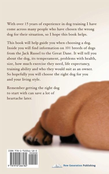 With over 15yrs experience in dog training I have come across many people who have chosen the wrong dog for their situation, so I hope this book helps. This book will help guide you when choosing a dog. Inside you will find information on 101 breeds of dogs from the Jack Russel to the Great Dane. It will tell you about the dog, its temperament, problems with health, size, how much exercise they need, life expectancy, Training ability and who they would suit as an owner. So hopefully you will choose the right dog for you and your living style. Remember getting the right dog to start with can save a lot of heartache later.