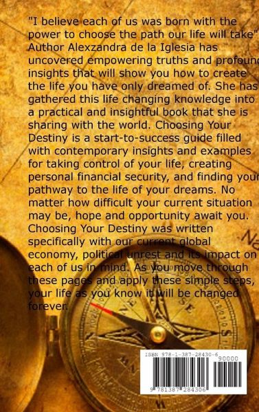 "I believe each of us was born with the power to choose the path our life will take". Author Alexzandra de la Iglesia has uncovered empowering truths and profound insights that will show you how to create the life you have only dreamed of. She has gathered this life changing knowledge into a practical and insightful book that she is sharing with the world. Choosing Your Destiny is a start-to-success guide filled with contemporary insights and examples for taking control of your life, creating personal financial security, and finding your pathway to the life of your dreams. No matter how difficult your current situation may be, hope and opportunity await you. Choosing Your Destiny was written specifically with our current global economy, political unrest and its impact on each of us in mind. As you move through these pages and apply these simple steps, your life as you know it will be changed forever.