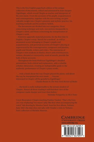 The first English paperback edition of the unique collection of documents which reveal Chopin as teacher and interpreter of his own music. From the accounts of his pupils, acquaintances and contemporaries, together with his own writing, we gain valuable insight into Chopin's pianistic and stylistic practice, his teaching methods and his aesthetic beliefs.