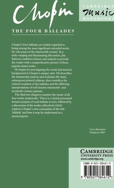 Chopin's four ballades are widely regarded as being among the most significant extended works for solo piano of the nineteenth century. In an illuminating discussion, Jim Samson combines history and analysis to provide a comprehensive picture of these popular piano works, investigating the social and musical background to Chopin's music, evaluating the many printed editions of the ballads before considering their critical reception and the differing interpretations of well-known nineteenth- and twentieth-century pianists.