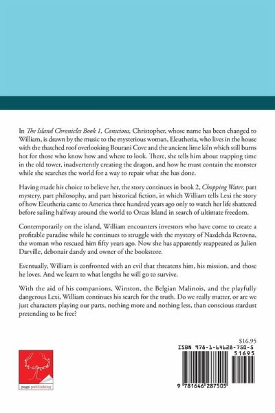 In The Island Chronicles Book 1, Conscious, Christopher, whose name has been changed to William, is drawn by the music to the mysterious woman, Eleutheria, who lives in the house with the thatched roof overlooking Bourani Cove and the ancient lime kiln which still burns hot for those who know how and where to look. There, she tells him about trapping time in the old tower, inadvertently creating the dragon, and how he must contain the monster while she searches the world for a way to repair what she has done. Having made his choice to believe her, the story continues in book 2, Chopping Water, part mystery, part philosophy, and part historical fiction, in which William tells Lexi the story of how Eleutheria came to America three hundred years ago only to watch her life shattered before sailing halfway around the world to Orcas Island in search of ultimate freedom. Contemporarily on the island, William encounters investors who have come to create a profitable paradise while he continues to struggle with the mystery of Nazdehda Retovna, the woman who rescued him fifty years ago. Now she has apparently reappeared as Julien Darville, debonair dandy and owner of the bookstore. Eventually, William is confronted with an evil that threatens him, his mission, and those he loves. And we learn to what lengths he will go to survive. With the aid of his companions, Winston, the Belgian Malinois, and the playfully dangerous Lexi, William continues his search for the truth. Do we really matter, or are we just characters playing our parts, nothing more and nothing less, than conscious stardust pretending to be free?