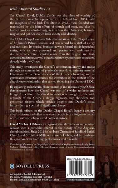 The first investigation into the choral foundation of the Chapel Royal, Dublin Castle. The Chapel Royal, Dublin Castle, was the place of worship of the British monarch's representative in Ireland from 1814 until the inception of the Irish Free State in 1922. It was founded and maintained by the joint efforts of church and state, and thus its history provides valuable insights into how the relationship between religion and politics shaped Irish society and identity. The Dublin Chapel was established in imitation of the Chapel Royal of St James's Palace, London, and was served by a staff of clergy and musicians. Its musical foundation was a formal and independent entity, with its own personnel and performance traditions. Its distinctive repertoire included music from the English and Irish cathedral traditions, as well as works written by composers associated directly with the Chapel. This study investigates the Chapel's constitution, liturgy and music through an examination of previously unexplored primary material. Discussion of the circumstances of the Chapel's founding and its governance structures situates the institution in the context of the church-state relationship that existed following the Union of 1800. Further, by exploring architecture, churchmanship and musical style, O'Shea demonstrates how the Chapel was part of a wider aesthetic and liturgical tradition. The choral foundation is brought to life with accounts of the Chapel's clergy, organists, boy choristers and gentleman singers, which provide insights into Dublin's social history during a period of significant change. This book reflects on the Dublin Chapel Royal's legacy a century after its closure and offers a new perspective into a forgotten corner of Irish cultural, religious and political history.