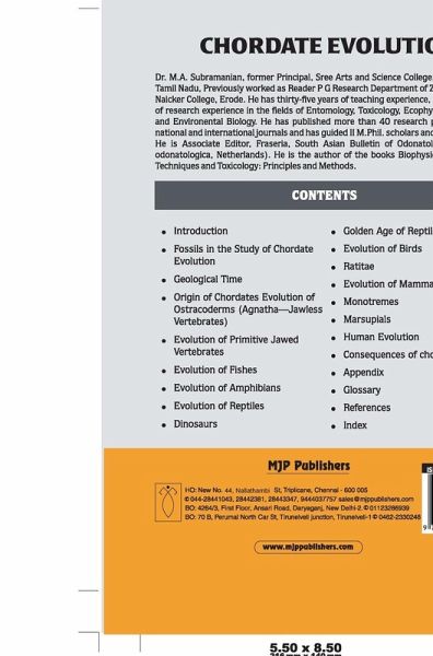 This book has been put forth as a general text book with the aim to provide a comprehensive and integrated account on chordate evolution. Chordata is a taxon which includes the well known vertebrates such as fishes, amphibians, reptiles, birds and mammals including human beings and are well represented in marine, fresh water, and terrestrial habitats. The subject matter of the book has been written in an easily accessible language and style. No doubt that this manual will be highly valuable to t
