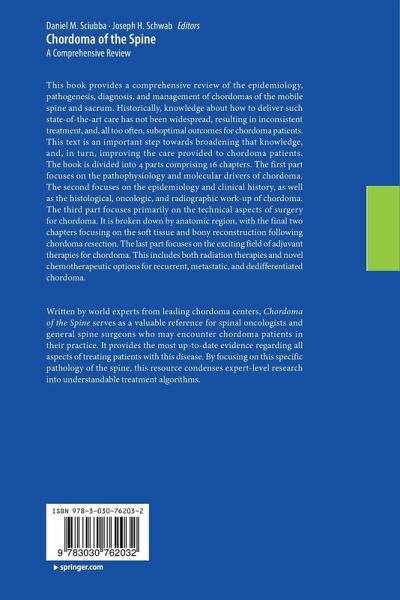 This book provides a comprehensive review of the epidemiology, pathogenesis, diagnosis, and management of chordomas of the mobile spine and sacrum. Historically, knowledge about how to deliver such state-of-the-art care has not been widespread, resulting in inconsistent treatment, and, all too often, suboptimal outcomes for chordoma patients. This text is an important step towards broadening that knowledge, and, in turn, improving the care provided to chordoma patients. The book is divided into 4 parts comprising 16 chapters. The first part focuses on the pathophysiology and molecular drivers of chordoma. The second focuses on the epidemiology and clinical history, as well as the histological, oncologic, and radiographic work-up of chordoma. The third part focuses primarily on the technical aspects of surgery for chordoma. It is broken down by anatomic region, with the final two chapters focusing on the soft tissue and bony reconstruction following chordoma resection. The last part focuses on the exciting field of adjuvant therapies for chordoma. This includes both radiation therapies and novel chemotherapeutic options for recurrent, metastatic, and dedifferentiated chordoma.