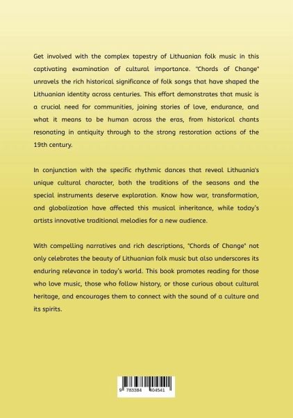 Get involved with the complex tapestry of Lithuanian folk music in this captivating examination of cultural importance. "Chords of Change" unravels the rich historical significance of folk songs that have shaped the Lithuanian identity across centuries. This effort demonstrates that music is a crucial need for communities, joining stories of love, endurance, and what it means to be human across the eras, from historical chants resonating in antiquity through to the strong restoration actions of the 19th century.In conjunction with the specific rhythmic dances that reveal Lithuania's unique cultural character, both the traditions of the seasons and the special instruments deserve exploration. Know how war, transformation, and globalization have affected this musical inheritance, while today's artists innovative traditional melodies for a new audience.With compelling narratives and rich descriptions, "Chords of Change" not only celebrates the beauty of Lithuanian folk music but also underscores its enduring relevance in today's world. This book promotes reading for those who love music, those who follow history, or those curious about cultural heritage, and encourages them to connect with the sound of a culture and its spirits.