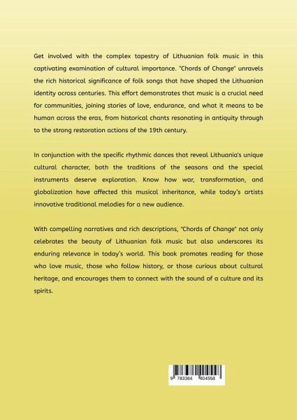 Get involved with the complex tapestry of Lithuanian folk music in this captivating examination of cultural importance. "Chords of Change" unravels the rich historical significance of folk songs that have shaped the Lithuanian identity across centuries. This effort demonstrates that music is a crucial need for communities, joining stories of love, endurance, and what it means to be human across the eras, from historical chants resonating in antiquity through to the strong restoration actions of the 19th century.In conjunction with the specific rhythmic dances that reveal Lithuania's unique cultural character, both the traditions of the seasons and the special instruments deserve exploration. Know how war, transformation, and globalization have affected this musical inheritance, while today's artists innovative traditional melodies for a new audience.With compelling narratives and rich descriptions, "Chords of Change" not only celebrates the beauty of Lithuanian folk music but also underscores its enduring relevance in today's world. This book promotes reading for those who love music, those who follow history, or those curious about cultural heritage, and encourages them to connect with the sound of a culture and its spirits.