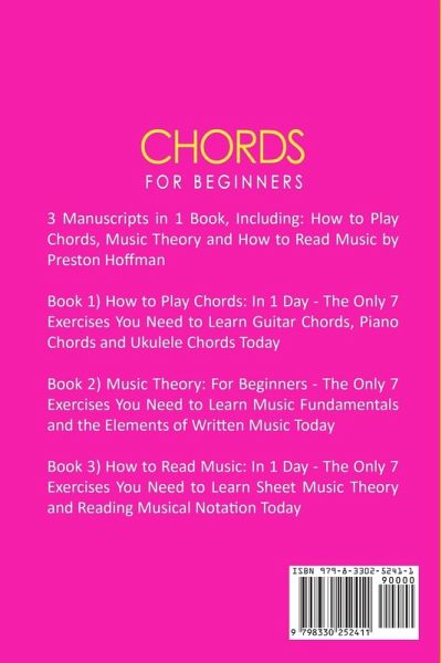 3 Manuscripts in 1 Book, Including: How to Play Chords, Music Theory and How to Read Music! Book 1) How to Play Chords: In 1 Day - The Only 7 Exercises You Need to Learn Guitar Chords, Piano Chords, and Ukulele Chords Today You will learn the following: -What chords are and how they are the building blocks of songs -How to read chord music -How to play chords on all three instruments with ease -Dozens of songs to play and the chords they use -Tips for chord songwriting -Chord practice tips -And much more! Book 2) Music Theory: For Beginners - The Only 7 Exercises You Need to Learn Music Fundamentals and the Elements of Written Music Today Do you get overwhelmed by all the complex concepts and want a book that is simple and clear? If so, "Music Theory: For Beginners" by Preston Hoffman is the book for you! It will provide you with seven key exercises that will help deepen your understanding of music theory! Book 3) How to Read Music: In 1 Day - The Only 7 Exercises You Need to Learn Sheet Music Theory and Reading Musical Notation Today You have made an excellent decision by choosing to learn chords. So, don't delay it any longer. Take this opportunity and purchase your copy today. Order "Chords: For Beginners" Now!