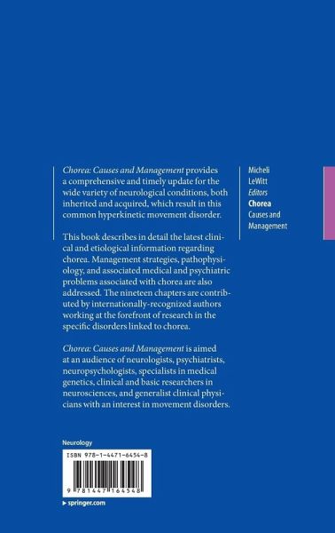 Clinician's Approach to Chorea.- Benign Hereditary Chorea.- Chorea Acanthocytosis.- Sydenham's Chorea.- Huntington Disease: Clinical Phenotypes, and Therapeutics.- Huntington Disease: Molecular Pathogenesis and New Therapeutic Perspectives.- Huntington disease and Huntington disease-like Syndromes - An Overview.- McLeod Syndrome.- Neuroferritinopathy.- Neurodegeneration with Brain Iron Accumulation.- Aceruloplasminemia.- Chorea in Inherited Ataxias.- Chorea in Prion Diseases.- Inherited Metabolic Disorders Causing Chorea.- Drug-Induced Chorea.- Structural Causes of Chorea.- Chorea: A Surgical Approach.- Chorea in Childhood.- Psychogenic Chorea.