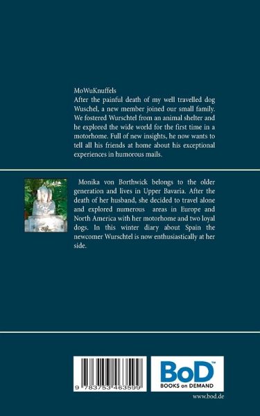 MoWuKnuffels?After the painful death of my well travelled dog Wuschel, a new member joined our small family. We fostered Wurschtel from an animal shelter and he explored a part of the wide world for the first time on this journey. This made him so enthusiastic that he wanted to tell all his friends at home about his experiences. He shifted to writing letters. But if the events exceeded his horizon of experience, his mistress Monika intervened helpfully with additions. The ten year old dog Knuffi endured with calmness the many ups and downs of a long motorhome journey. After all, she had already accompanied her owner to Canada, Mexico and the USA. So, she was not easily impressed.In his diary, Wurschtel describes his daily experiences continuously and comprehensively, and with his own sense of humor he reflects on the host country and the people he met.