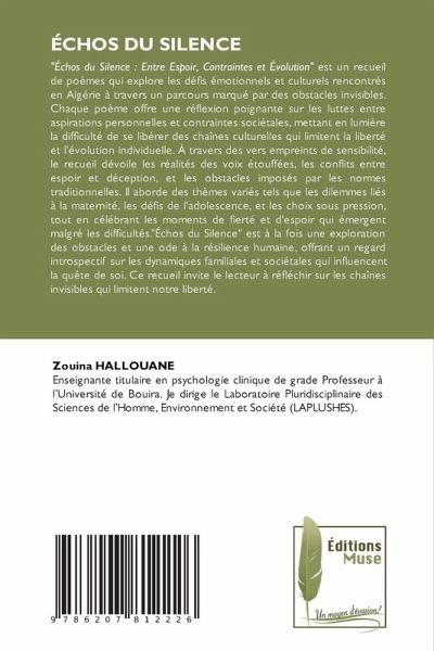 "Échos du Silence : Entre Espoir, Contraintes et Évolution" est un recueil de poèmes qui explore les défis émotionnels et culturels rencontrés en Algérie à travers un parcours marqué par des obstacles invisibles. Chaque poème offre une réflexion poignante sur les luttes entre aspirations personnelles et contraintes sociétales, mettant en lumière la difficulté de se libérer des chaînes culturelles qui limitent la liberté et l'évolution individuelle. À travers des vers empreints de sensibilité, le recueil dévoile les réalités des voix étouffées, les conflits entre espoir et déception, et les obstacles imposés par les normes traditionnelles. Il aborde des thèmes variés tels que les dilemmes liés à la maternité, les défis de l'adolescence, et les choix sous pression, tout en célébrant les moments de fierté et d'espoir qui émergent malgré les difficultés."Échos du Silence" est à la fois une exploration des obstacles et une ode à la résilience humaine, offrant un regard introspectif sur les dynamiques familiales et sociétales qui influencent la quête de soi. Ce recueil invite le lecteur à réfléchir sur les chaînes invisibles qui limitent notre liberté.