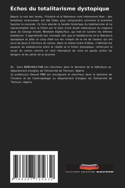 Depuis la nuit des temps, l'histoire et la littérature sont intimement liées ; des tentatives incessantes ont été faites pour comprendre comment la première façonne la seconde. Ce livre aborde la facette historique du totalitarisme et sa représentation dans la fiction par le biais d'une étude méticuleuse du magnum opus de George Orwell, Nineteen Eighty-Four, qui met en lumière les thèmes totalitaires. Il approfondit des concepts tels que le totalitarisme et la littérature dystopique et jette un coup d'oeil sur les croquis de la vie de l'auteur qui ont servi de base à l'écriture du roman. Dans le même ordre d'idées, il délimite les aspects du totalitarisme entre la réalité et la fiction dystopique, renforçant la vision du roman comme un récit intemporel de mise en garde contre les dangers et les périls de la tyrannie.