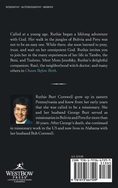 Called at a young age, Ruthie began a lifelong adventure with God. Her walk in the jungles of Bolivia and Peru was not to be an easy one. While there, she soon learned to pray, trust, and wait on her omnipotent God. Ruthie invites you to join her in the many experiences of her life in Tambo, the Beni, and Tushmo. Meet Mom Jenofsky, Ruthie's delightful companion; Raul, the neighborhood witch doctor; and many others in Chosen Before Birth.