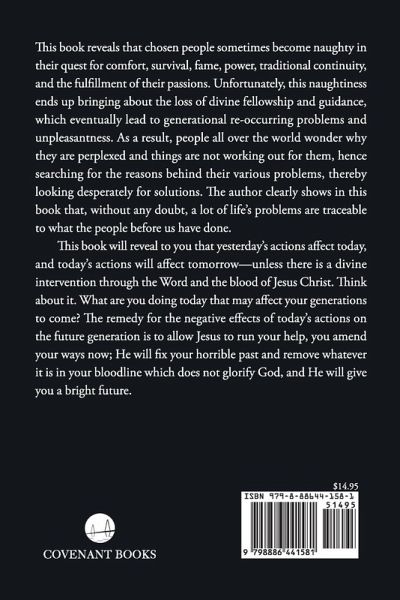 This book reveals that chosen people sometimes become naughty in their quest for comfort, survival, fame, power, traditional continuity, and the fulfillment of their passions. Unfortunately, this naughtiness ends up bringing about the loss of divine fellowship and guidance, which eventually lead to generational re-occurring problems and unpleasantness. As a result, people all over the world wonder why they are perplexed and things are not working out for them, hence searching for the reasons behind their various problems, thereby looking desperately for solutions. The author clearly shows in this book that, without any doubt, a lot of life's problems are traceable to what the people before us have done. This book will reveal to you that yesterday's actions affect today, and today's actions will affect tomorrow--unless there is a divine intervention through the Word and the blood of Jesus Christ. Think about it. What are you doing today that may affect your generations to come? The remedy for the negative effects of today's actions on the future generation is to allow Jesus to run your help, you amend your ways now; He will fix your horrible past and remove whatever it is in your bloodline which does not glorify God, and He will give you a bright future.