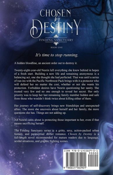 A hidden bloodline, an ancient order out to destroy it. Twenty-eight-year-old Nesrin left everything she knew behind in hopes of a fresh start. Building a new life and remaining anonymous is a balancing act, one she thought she had perfected. That was until a series of run-ins with the Pacific Northwest Pack brings with it a protector who will defend her no matter the cost, whether or not she wants his protection. Forbidden desires have Nesrin questioning her sanity. She trusted very few and no one enough to reveal her secret. Her only priority was to keep her last remaining family member hidden and safe from those who wouldn't think twice about killing either of them. Her journey of self-discovery brings new friendships and unexpected allies. The more she uncovers about herself and her family, the more questions she has. Things are not adding up. All Nesrin cares about is protecting those important to her, even if that means sacrificing herself. ¿ The Finding Sanctuary series is a gritty, sexy, action-packed urban fantasy, and paranormal shifter romance. Chosen by Destiny is a full-length novel recommended for mature readers due to language, sexual situations, and graphic fighting scenes.