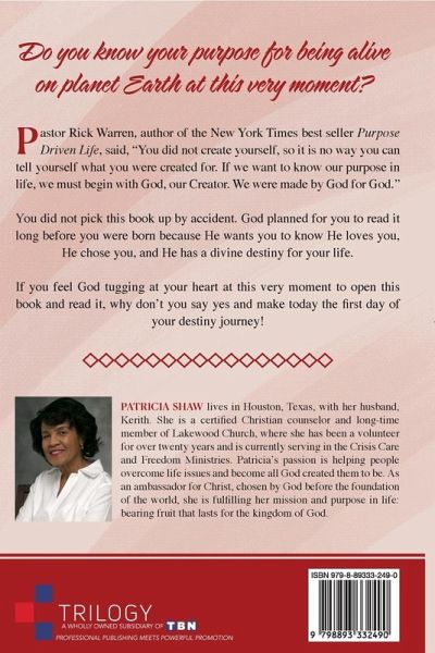 Do you know your purpose for being alive on planet Earth at this very moment? Pastor Rick Warren, author of the New York Times best seller Purpose Driven Life, said, "You did not create yourself, so it is no way you can tell yourself what you were created for. If we want to know our purpose in life, we must begin with God, our Creator. We were made by God for God." You did not pick this book up by accident. God planned for you to read it long before you were born because He wants you to know He loves you, He chose you, and He has a divine destiny for your life. If you feel God tugging at your heart at this very moment to open this book and read it, why don't you say yes and make today the first day of your destiny journey!