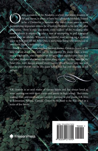 Orion, a student of the Academy, a school that trains devotees of the god Aarus, is about to have his eighteenth birthday. Trained to be a Chronicler, a historian who travels from town to town documenting important events, he is looking forward to his new life after graduation. There is only one hitch: every student of the Academy who turns eighteen is required to take a turn at attempting to pull a magical sword from an obelisk. Whoever is successful must set out on a perilous quest to find and kill the False One, a mysterious being who attempted to overthrow Aarus a millennia ago. Much to everyone's surprise, and his own dismay, Orion is chosen as the next Quester and is soon sent out on his journey. He meets Cassi, a feisty young blacksmith, who joins him on his quest, and together they must face the killer Shadows who haunt the forest along the way. As they hunt for the False One, with danger around every corner, Orion knows only too well that no peer who set out on this quest before him has ever returned to tell the tale.