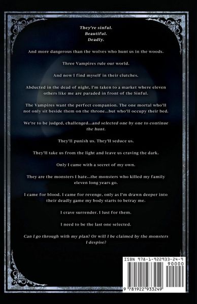 They're sinful. Beautiful.Deadly. And more dangerous than the wolves who hunt us in the woods. Three Vampires rule our world. And now I find myself in their clutches. Abducted in the dead of night, I'm taken to a market where eleven others like me are paraded in front of the Sinful. The Vampires want the perfect companion. The one mortal who'll not only sit beside them on the throne...but who'll occupy their bed. We're to be judged, challenged...and selected one by one to continue the hunt. They'll punish us. They'll seduce us. They'll take us from the light and leave us craving the dark. Only I came with a secret of my own. They are the monsters I hate...the monsters who killed my family eleven long years go. I came for blood. I came for revenge, only as I'm drawn deeper into their deadly game my body starts to betray me. I crave surrender. I lust for them. I need to be the last one selected. Can I go through with my plan? Or will I be claimed by the monsters I despise?