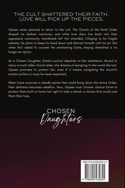 THE CULT SHATTERED THEIR FAITH. LOVE WILL PICK UP THE PIECES. Ulysses never planned to return to the cult. The Church of the Ninth Order shaped his darkest memories, and while love drew him back into their oppressive community, heartbreak left him stranded. Clinging to his fragile sobriety, he plans to keep his head down and distract himself with his art. But when he's asked to counsel the enchanting Esme, staying detached is no longer an option. As a Chosen Daughter, Esme's survival depends on her submission. Bound to marry a much older church elder, she dreams of escaping to the world she lost. Ulysses promises to protect her, even if it means navigating the church's sinister politics in ways he never expected. When Esme uncovers a deadly secret that could bring down the entire Order, their defiance becomes rebellion. Now, Ulysses must choose: silence Esme to protect them both or honor her right to take a stand-a choice that could cost them their lives.