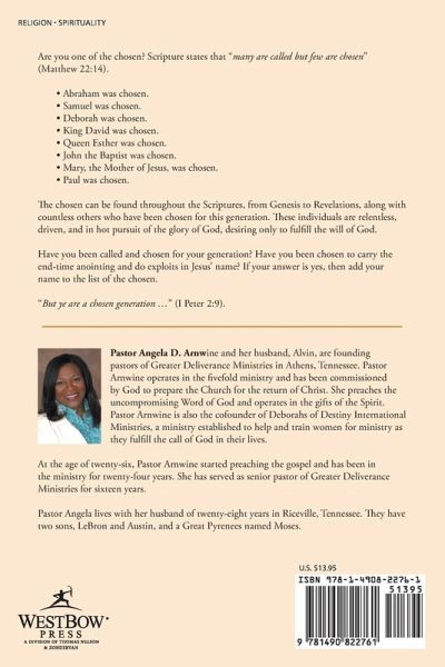 Are you one of the chosen? Scripture states that "many are called but few are chosen" (Matthew 22:14). • Abraham was chosen. • Samuel was chosen. • Deborah was chosen. • King David was chosen. • Queen Esther was chosen. • John the Baptist was chosen. • Mary, the Mother of Jesus, was chosen. • Paul was chosen. The chosen can be found throughout the Scriptures, from Genesis to Revelations, along with countless others who have been chosen for this generation. These individuals are relentless, driven, and in hot pursuit of the glory of God, desiring only to fulfill the will of God. Have you been called and chosen for your generation? Have you been chosen to carry the end-time anointing and do exploits in Jesus' name? If your answer is yes, then add your name to the list of the chosen. "But ye are a chosen generation ..." (I Peter 2:9).
