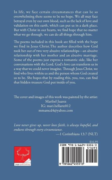 In life, we face certain circumstances that can be so overwhelming there seems to be no hope. We all may face betrayal even by our own blood, such as the lack of love and validation on this earth, which can put us in a dark place. But with Christ in our hearts, we find hope that no matter what we go through, we can do all things through him. The poems included in this book are filled with the hope we find in Jesus Christ. The author describes how God took her out of two very abusive relationships--an abusive relationship with her mother and an abusive marriage. Some of the poems just express a romantic side, like her conversations with the Lord. God's love can transform us in a way that we could never imagine. Through Jesus Christ, we find who lives within us and the person whom God created us to be. She hopes that by reading this, you, too, can find that hidden treasure God put inside of you. The cover and images of this work was painted by the artist: Maribel Juarez IG: mari.bellarte012 mmamcd4@yahoo.com Love never gives up, never loses faith, is always hopeful, and endures through every circumstance. --1 Corinthians 13:7 (NLT)