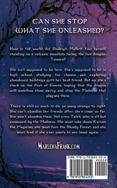 Can she stop what she unleashed? How in the world did Shaleigh Mallett find herself standing on a volcanic mountain facing the fire dragon, Tanwen? She isn't supposed to be here. She's supposed to be in high school, studying for classes and exploring abandoned buildings with her best friend. But no, she's stuck on the Peak of Gwern, hoping that the dragon will somehow show mercy and stop the Madness that plagues them. There is still so much to do, so many wrongs to right. She can't abandon her friends after she's come so far. She won't abandon them. Not even Talek, who is all but consumed by the Madness. She must take down Keriam the Magician, she must face the Bloody Forest, and she must lead if she ever wants to see home again.