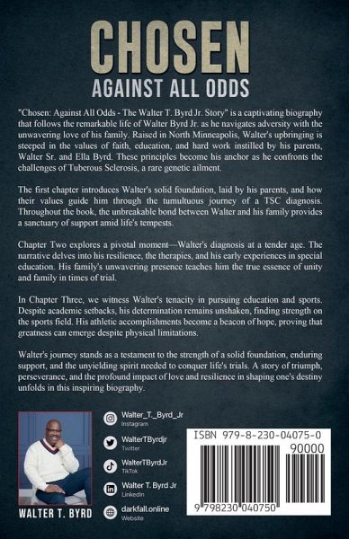 Step into the extraordinary journey of Walter T. Byrd Jr., a filmmaker, author, and survivor who overcame insurmountable odds to find resilience, hope, and purpose. In this deeply personal memoir, Walter shares his battle with a rare medical condition, Tuberous Sclerosis Complex, and his harrowing fight against COVID-19-a fight that left him on a ventilator for 59 days. More than a story of survival, Chosen: Against All Odds explores the power of faith, the strength of family, and the courage to persevere through life's darkest moments. From humble beginnings in North Minneapolis to becoming a voice of inspiration, Walter reflects on how challenges shaped his purpose and passion for storytelling. With heartfelt honesty and unshakable resolve, this book is a testament to the human spirit's ability to rise above adversity. Perfect for readers seeking inspiration, faith, and a reminder that every challenge can be an opportunity to grow.