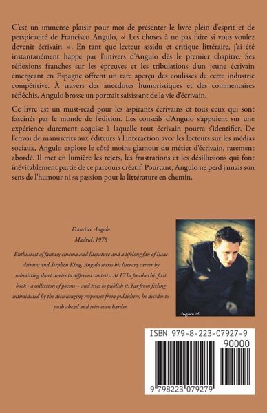 C'est un immense plaisir pour moi de présenter le livre plein d'esprit et de perspicacité de Francisco Angulo, « Les choses à ne pas faire si vous voulez devenir écrivain ». En tant que lecteur assidu et critique littéraire, j'ai été instantanément happé par l'univers d'Angulo dès le premier chapitre. Ses réflexions franches sur les épreuves et les tribulations d'un jeune écrivain émergeant en Espagne offrent un rare aperçu des coulisses de cette industrie compétitive. À travers des anecdotes humoristiques et des commentaires réfléchis, Angulo brosse un portrait saisissant de la vie d'écrivain. Ce livre est un must-read pour les aspirants écrivains et tous ceux qui sont fascinés par le monde de l'édition. Les conseils d'Angulo s'appuient sur une expérience durement acquise à laquelle tout écrivain pourra s'identifier. De l'envoi de manuscrits aux éditeurs à l'interaction avec les lecteurs sur les médias sociaux, Angulo explore le côté moins glamour du métier d'écrivain, rarement abordé. Il met en lumière les rejets, les frustrations et les désillusions qui font inévitablement partie de ce parcours créatif. Pourtant, Angulo ne perd jamais son sens de l'humour ni sa passion pour la littérature en chemin. En tant qu'écrivain moi-même, j'ai trouvé les difficultés d'Angulo universellement identifiables en dépit de nos horizons différents. Il nous rappelle que l'écriture exige une détermination infatigable face aux obstacles et aux doutes constants. Sa persévérance est inspirante, et les leçons qu'il enseigne s'appliquent bien au-delà du domaine littéraire. Ce récit autobiographique met en lumière les défis universels de la poursuite de ses rêves et offre une sagesse pouvant motiver tout artiste ou entrepreneur. Bien que le monde de l'édition ait radicalement changé depuis les débuts d'Angulo, les défis essentiels demeurent. Se faire publier n'a jamais été facile, et la sagesse durement acquise d'Angulo n'a jamais été plus pertinente. Les aspirants auteurs d'aujourd'hui sont confrontés à une industrie de l'édition de plus en plus compétitive, ainsi qu'aux distractions des médias sociaux et à la menace du piratage en ligne. Les perspectives franches d'Angulo sont donc plus précieuses que jamais pour guider les écrivains dans leur parcours. Même à l'ère numérique, le dévouement, la persévérance et la confiance en soi restent essentiels pour réaliser ses ambitions littéraires.