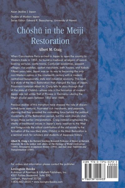When Commodore Perry arrived in Japan to open the country to Western trade in 1853, he found a medieval amalgam of sword-bearing samurai, castle towns, Confucian academies, peasant villages, rice paddies, upstart merchants, bath houses, and Kabuki. Fifteen years later, Japan was on its way to becoming the only non-Western nation in the nineteenth century with a modern centralized bureaucratic state and industrial economy. This book is a study of the Meiji Restoration that changed the face of Japan. Prominent historian Albert M. Craig tells its story through that of the domain of Choshu-whose role in the formation of modern Japan was not unlike that of Prussia in Germany-during the fifteen crucial years between 1853 and 1868. Whereas previous studies have stressed the role of discontented lower samurai and frustrated rich merchants and peasants in this transition, claiming that they provided the motive power behind the political movements of the Restoration period, this work sharply challenges these earlier interpretations. Craig instead emphasizes the vitality of traditional values in Japan's early reaction to the West and foregrounds the critical contribution of the old society to the formation of the new Meiji state. Choshu in the Meiji Restoration is a seminal work for scholars and students of Japanese history.