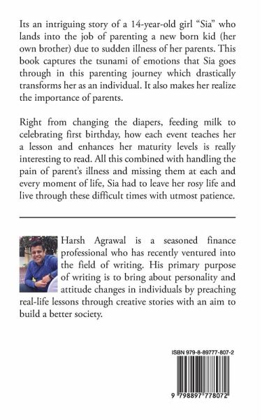 Its an intriguing story of a 14-year-old girl "Sia" who lands into the job of parenting a new born kid (her own brother) due to sudden illness of her parents. This book captures the tsunami of emotions that Sia goes through in this parenting journey which drastically transforms her as an individual. It also makes her realize the importance of parents. Right from changing the diapers, feeding milk to celebrating first birthday, how each event teaches her a lesson and enhances her maturity levels is really interesting to read. All this combined with handling the pain of parent's illness and missing them at each and every moment of life, Sia had to leave her rosy life and live through these difficult times with utmost patience.