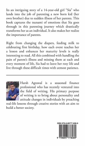 Its an intriguing story of a 14-year-old girl "Sia" who lands into the job of parenting a new born kid (her own brother) due to sudden illness of her parents. This book captures the tsunami of emotions that Sia goes through in this parenting journey which drastically transforms her as an individual. It also makes her realize the importance of parents. Right from changing the diapers, feeding milk to celebrating first birthday, how each event teaches her a lesson and enhances her maturity levels is really interesting to read. All this combined with handling the pain of parent's illness and missing them at each and every moment of life, Sia had to leave her rosy life and live through these difficult times with utmost patience.