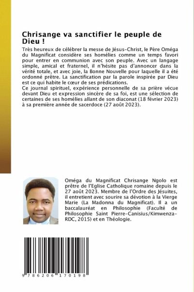 Très heureux de célébrer la messe de Jésus-Christ, le Père Oméga du Magnificat considère ses homélies comme un temps favori pour entrer en communion avec son peuple. Avec un langage simple, amical et fraternel, il n'hésite pas d'annoncer dans la vérité totale, et avec joie, la Bonne Nouvelle pour laquelle il a été ordonné prêtre. La sanctification par la parole inspirée par Dieu est ce qui habite le coeur de ses prédications. Ce journal spirituel, expérience personnelle de sa prière vécue devant Dieu et expression sincère de sa foi, est une sélection de certaines de ses homélies allant de son diaconat (18 février 2023) à sa première année de sacerdoce (27 août 2023).