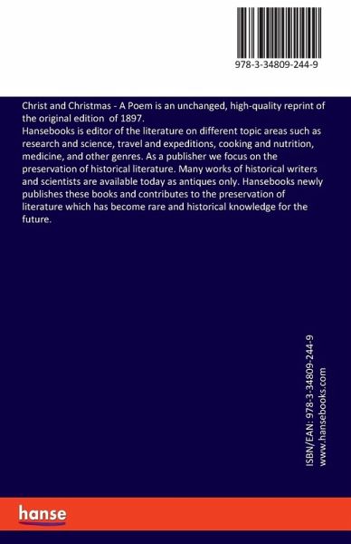 Christ and Christmas - A Poem is an unchanged, high-quality reprint of the original edition of 1897.Hansebooks is editor of the literature on different topic areas such as research and science, travel and expeditions, cooking and nutrition, medicine, and other genres. As a publisher we focus on the preservation of historical literature. Many works of historical writers and scientists are available today as antiques only. Hansebooks newly publishes these books and contributes to the preservation of literature which has become rare and historical knowledge for the future.
