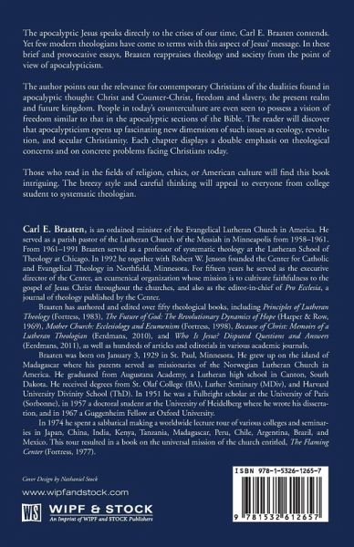 The apocalyptic Jesus speaks directly to the crises of our time, Carl E. Braaten contends. Yet few modern theologians have come to terms with this aspect of Jesus' message. In these brief and provocative essays, Braaten reappraises theology and society from the point of view of apocalypticism. The author points out the relevance for contemporary Christians of the dualities found in apocalyptic thought: Christ and Counter-Christ, freedom and slavery, the present realm and future kingdom. People in today's counterculture are even seen to possess a vision of freedom similar to that in the apocalyptic sections of the Bible. The reader will discover that apocalypticism opens up fascinating new dimensions of such issues as ecology, revolution, and secular Christianity. Each chapter displays a double emphasis on theological concerns and on concrete problems facing Christians today. Those who read in the fields of religion, ethics, or American culture will find this book intriguing. The breezy style and careful thinking will appeal to everyone from college student to systematic theologian.