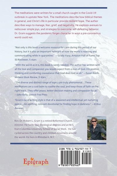 The meditations were written for a small church caught in the Covid-19 outbreak in the mid-Hudson region of New York State. The author describes how biblical themes in general, and Christ’s life, in particular, provide resilient hope during the pandemic. Throughout, the author offers insight, along with practical steps to thrive rather than survive. Dr. Gram discusses ways to manage fear, grief, and negativity. He explores the rise of self-defeating behaviors, and how to overcome them. The reader is challenged to simplify life, like Jesus, so that overlooked daily blessings can be celebrated. The author also provides understanding of how coronavirus distorts our understanding of reality. Each meditation begins with Scripture and ends with a brief prayer. Generally Dr. Gram suggests the pandemic forges our character in ways a pre-coronavirus world could not. The book offers comfort to anyone undergoing great stress, regardless of its cause.