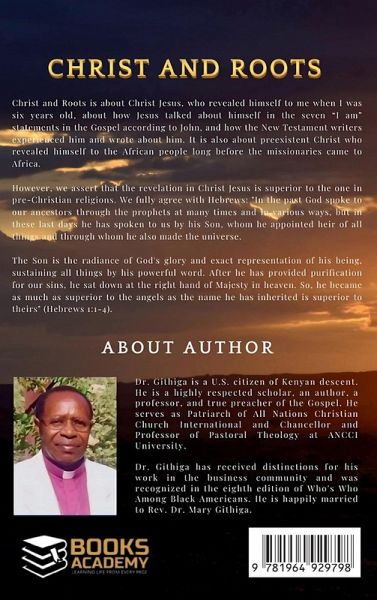 Christ and Roots is about Christ Jesus, who revealed himself to me when I was six years old, about how Jesus talked about himself in the seven "I am" statements in the Gospel according to John, and how the New Testament writers experienced him and wrote about him. It is also about preexistent Christ who revealed himself to the African people long before the missionaries came to Africa. However, we assert that the revelation in Christ Jesus is superior to the one in pre-Christian religions. We fully agree with Hebrews: "In the past God spoke to our ancestors through the prophets at many times and in various ways, but in these last days he has spoken to us by his Son, whom he appointed heir of all things and through whom he also made the universe. The Son is the radiance of God's glory and exact representation of his being, sustaining all things by his powerful word. After he has provided purification for our sins, he sat down at the right hand of Majesty in heaven. So, he became as much as superior to the angels as the name he has inherited is superior to theirs" (Hebrews 1:1-4). ABOUT THE AUTHOR: Dr. Githiga is a U.S. citizen of Kenyan descent. He is a highly respected scholar, an author, a professor, and true preacher of the Gospel. He serves as Patriarch of All Nations Christian Church International and Chancellor and Professor of Pastoral Theology at ANCCI University. Dr. Githiga has received distinctions for his work in the business community and was recognized in the eighth edition of Who's Who Among Black Americans. He is happily married to Rev. Dr. Mary Githiga.